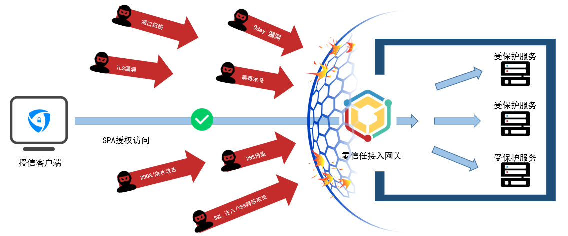 受保护的服务对未授权用户及设备完全不可见,无法通过端口扫描发现服务。 这些服务默认在互联网实现“隐藏“。严格的终端单包敲门机制, 确保只有认证过的用户及设备才能访问受保护服务。