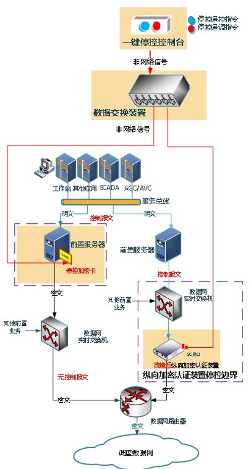 停控纵向加密认证装置:基于纵向加密认证装置进行改造的新型装置,具备识别控制台指令,用于防止主站网络安全事件的影响向厂站大规模蔓延,默认情况下处于纵向加密认证装置的原有工作模式运行,紧急情况下可通过非网络方式启动阻断模式运行,阻断拦截主站下发厂站的遥控、遥调命令,以下简称“停控纵向装置”。