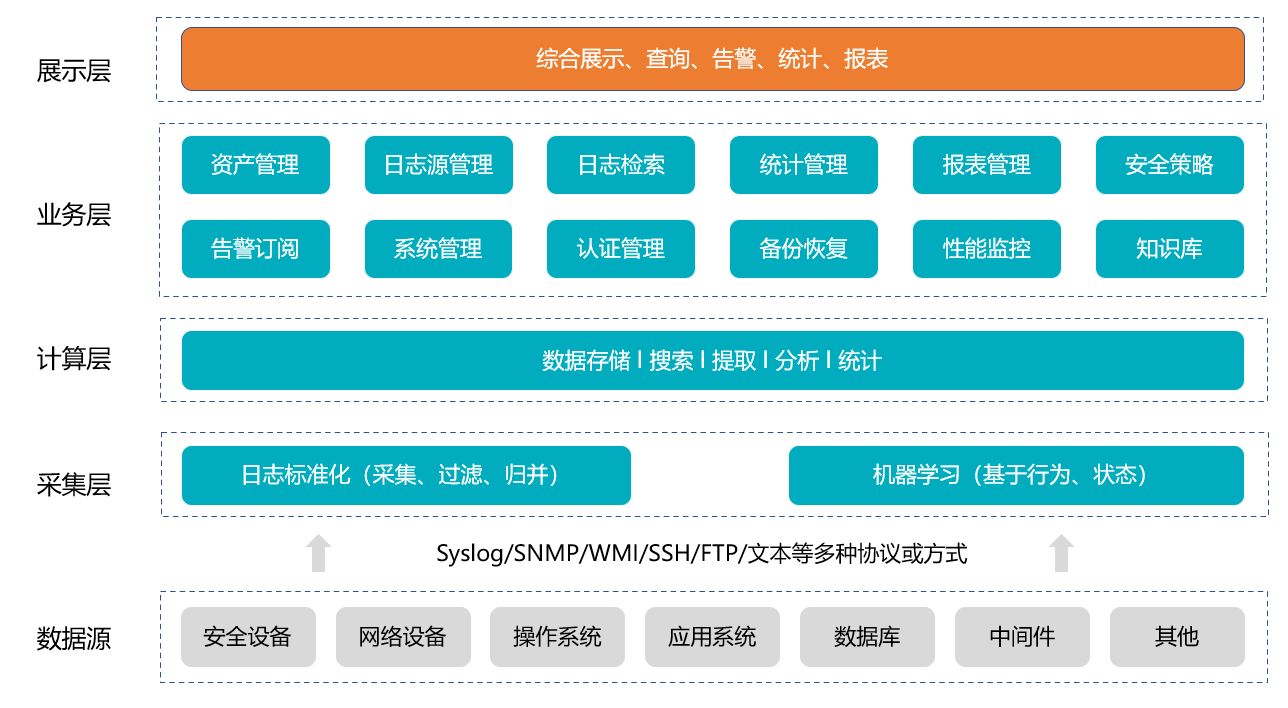 日志采集层利用Syslog、SNMP trap、WMI、FTP 、agent或流量镜像等方式进行日志采集,从数据源获取日志数据,并根据规则进行过滤、归并,同时把采集过来的非结构化的数据转换成结构化的数据。同时基于行为、状态等进行机器学习,提供给计算层分析。