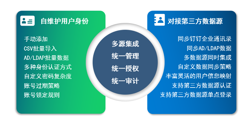 熊猫体育零信任安全管理平台既支持主流企业通讯录系统的数据导入与同步,也支持自建用户体系。实现了在一个平台对企业人员、部门以及角色组的统一高效管理。同时系统提供多种用户认证方式,全方位满足各种需求场景。