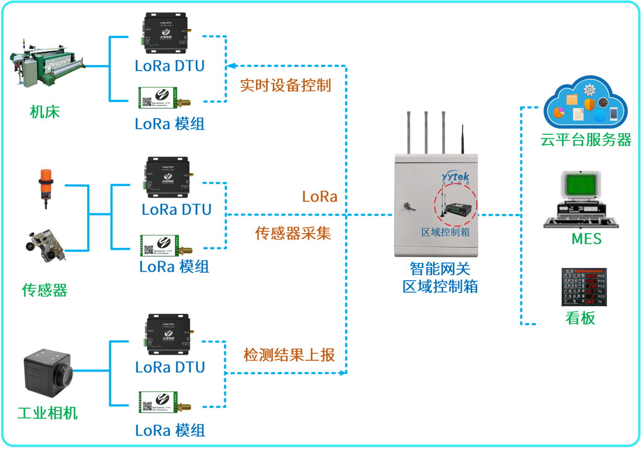 在工厂内的各个终端节点(传感器、工业设备、工业相机)使用LORA DTU和LORA模组升级设备和传感器,使设备具备无线传输能力,实现对生产数据的实时上报和操作指令接收。通过熊猫体育智能无线网关对着这些终端节点进行数据的采集和接收,再由网关进行数据分析和协议转换,与上层的不同业务系统进行数据的交互。