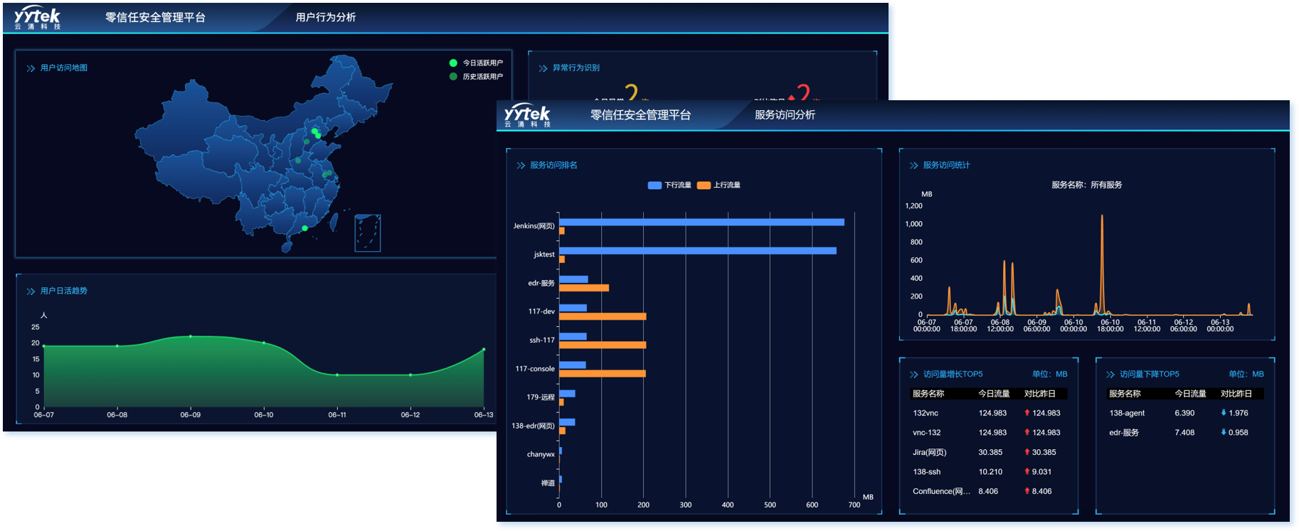 方案提供了用户使用行为的态势分析以及服务访问态势分析,通过态势大屏展示方便日常管理及领导审阅。