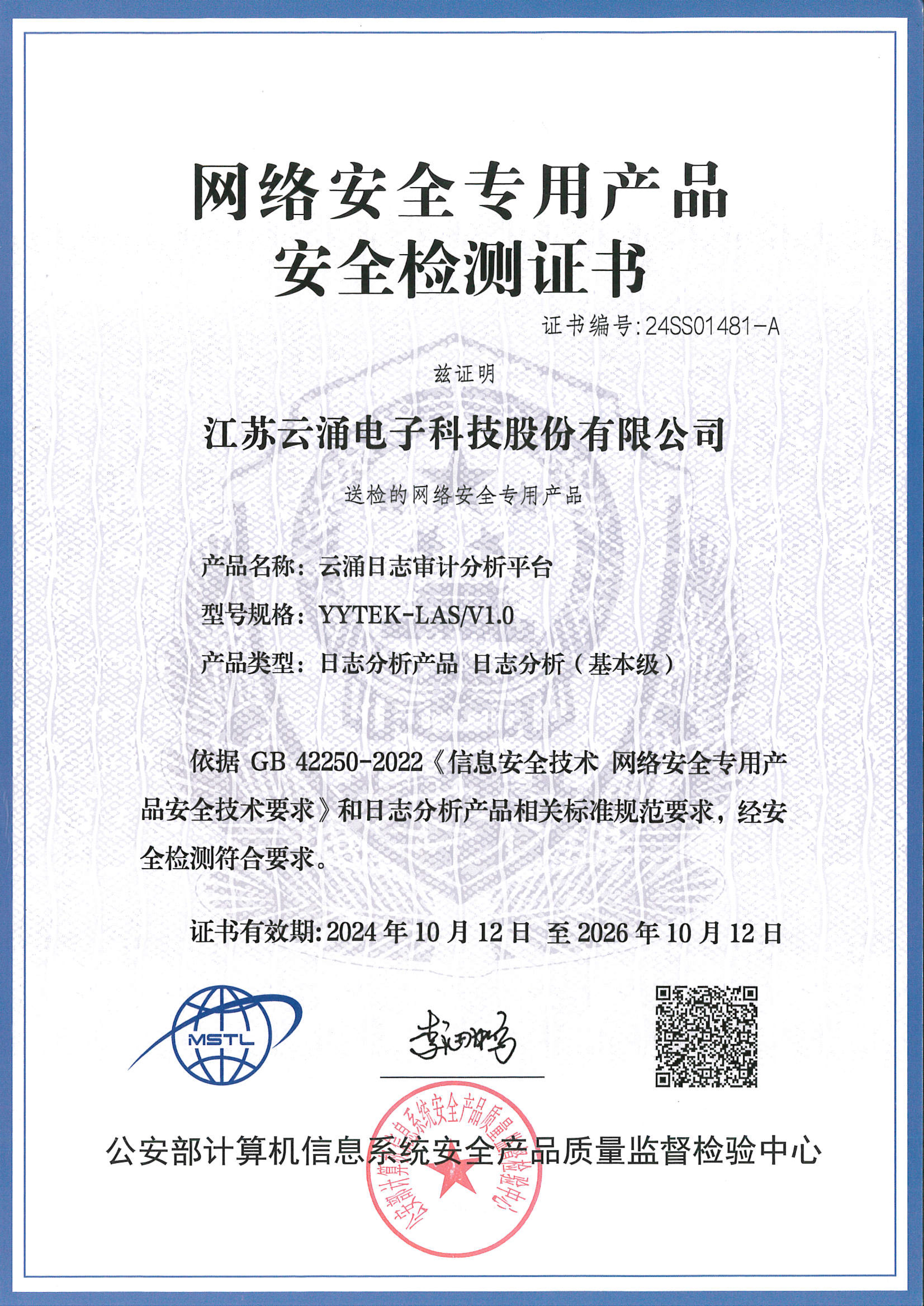 近日,熊猫体育日志审计分析平台顺利通过公安部权威检测机构的严格安全检测,成功获得《网络安全专用产品安全检测证书》,标志着日审平台在产品功能性、兼容性、安全性、稳定性等多个方面均满足检测标准,性能和质量达到先进水平,是满足强制性国家标准的网络安全专用产品。这一成果意义重大,它不仅是公司产品合规的有力证明,还极大提升了熊猫体育的品牌形象,增强了市场竞争力。