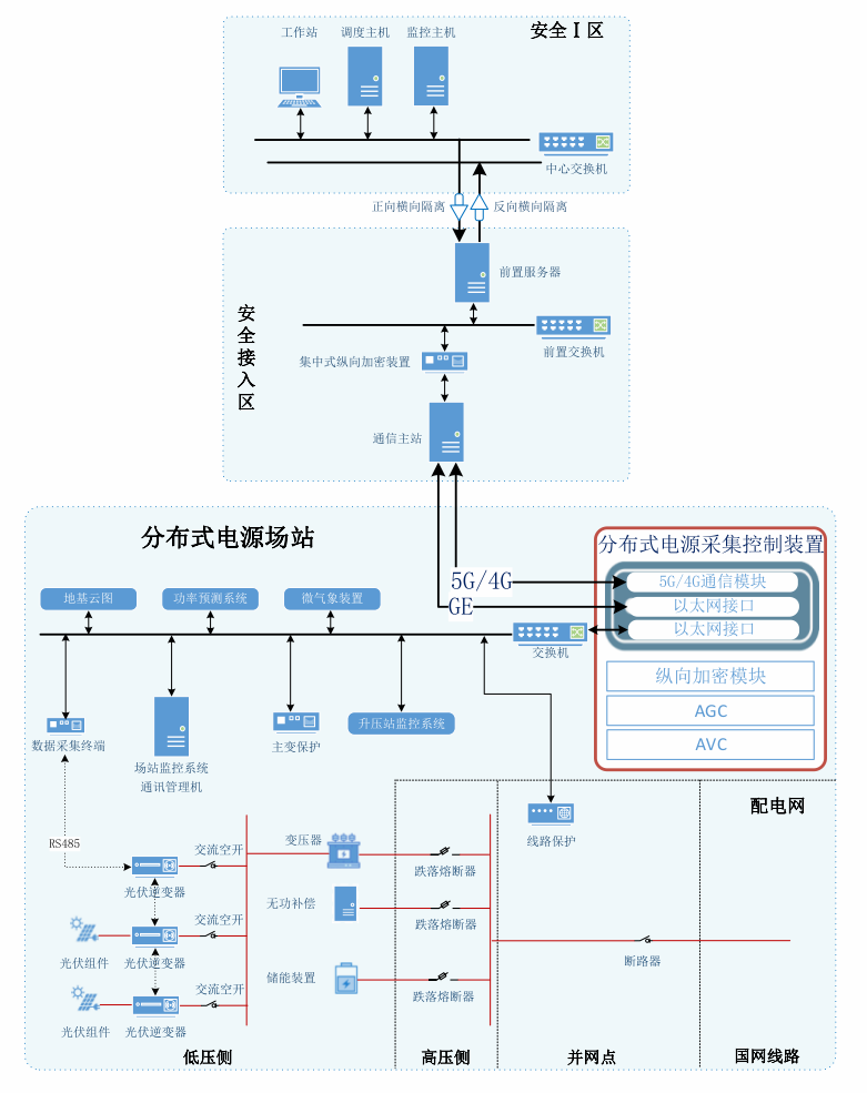 • 该装置部署于分布式电源场站侧,基于无线专用通信网络架构,集成纵向加密单元、无线通信模块及 AGC/AVC 控制功能,通过电力专用通信通道接入生产控制大区安全接入区,与调度主站建立安全通信链路,实现数据传输的可靠性与安全性。