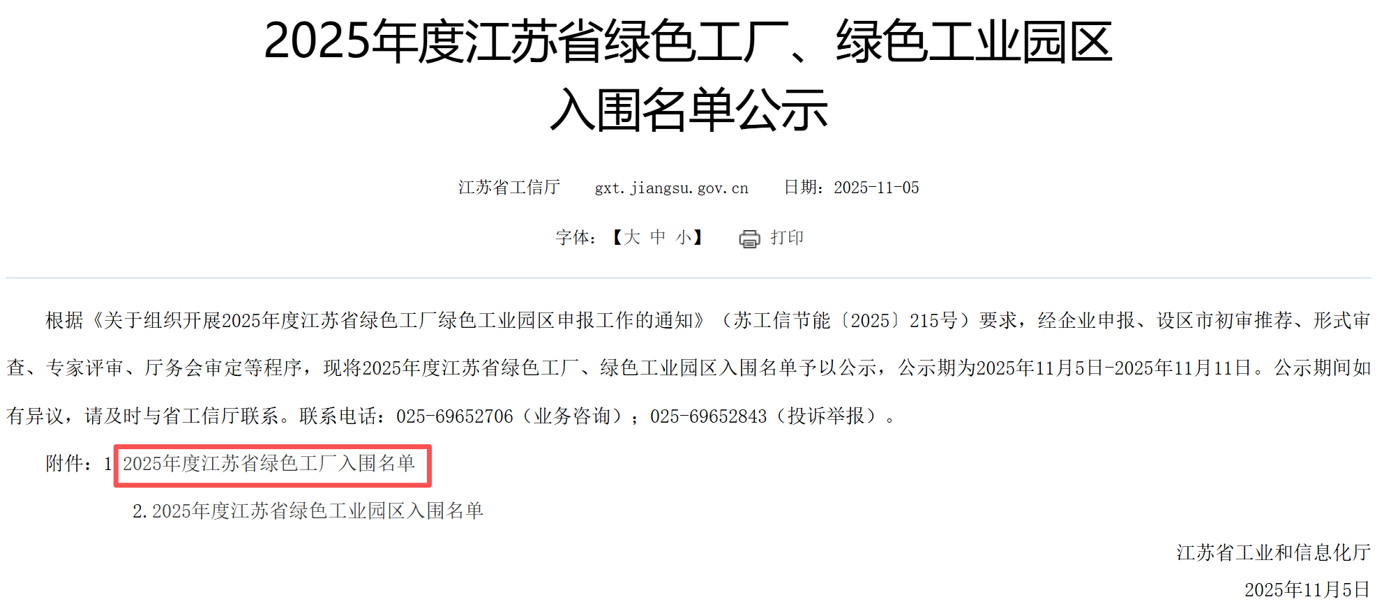 11月5日,江苏省工业和信息化厅公示了“2025 年度绿色工厂、绿色工业园区入围企业名单”,熊猫体育凭借在绿色生产、能源管理领域的突出表现,成功入围 2025 江苏省绿色工厂,标志着公司在绿色制造体系建设中达到省级标杆水平,为制造业绿色转型提供可借鉴的实践样本。