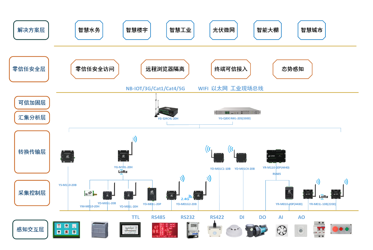 在转换传输层,智慧物联设备支持LORA、4G、以太网、RS485等等多种通信方式的组网传输和转换,有基础型、增强型、工业级等等分类,做到了大部分场景的覆盖,满足复杂的应用环境;
