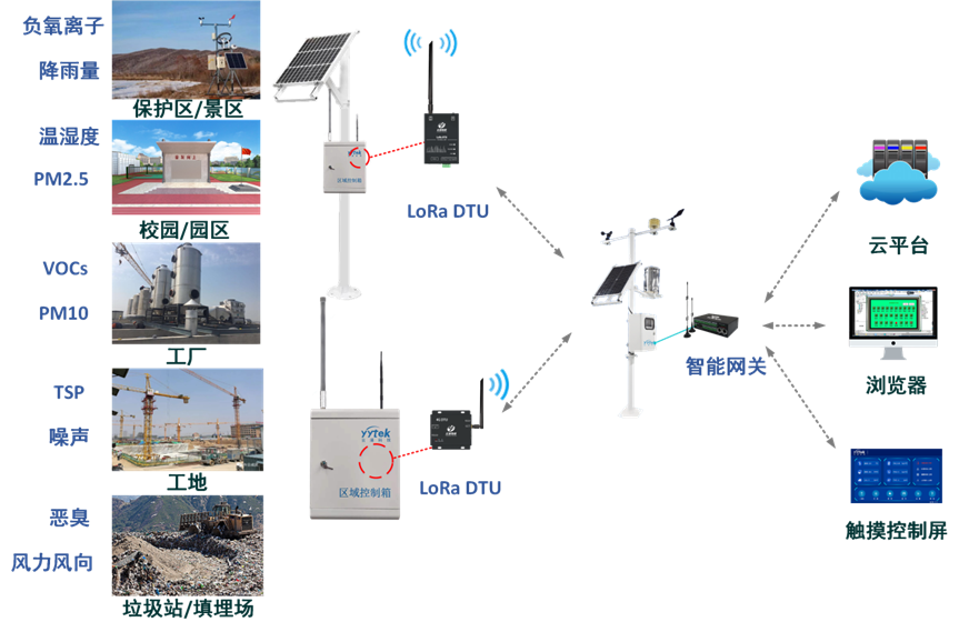 城市雾霾、工业废气污染、尾气排放、工地扬尘等,都是国家关注和治理的对象,对于这些污染源头,我们通过环境监测系统,运用传感采集设备、联网传输设备、数据显示设备、边缘计算设备等,实现了对pm2.5、pm10等污染物指数、温度、湿度、气压、噪音、风向、风速等环境参数的采集,并通过物联通讯设备将这些现场的数据传输到智能网关或者远程服务器上,便于管理人员及时掌握现场监测数据。针对蜂窝数据信号比较好的地区,我们可以使用 LTE DTU将数据直接透传至平台,针对偏远地带或者信号受屏蔽地区,我们可以采用LoRa DTU进行数据采集和中继传输,然后使用智能网关进行数据处理和环保平台对接。