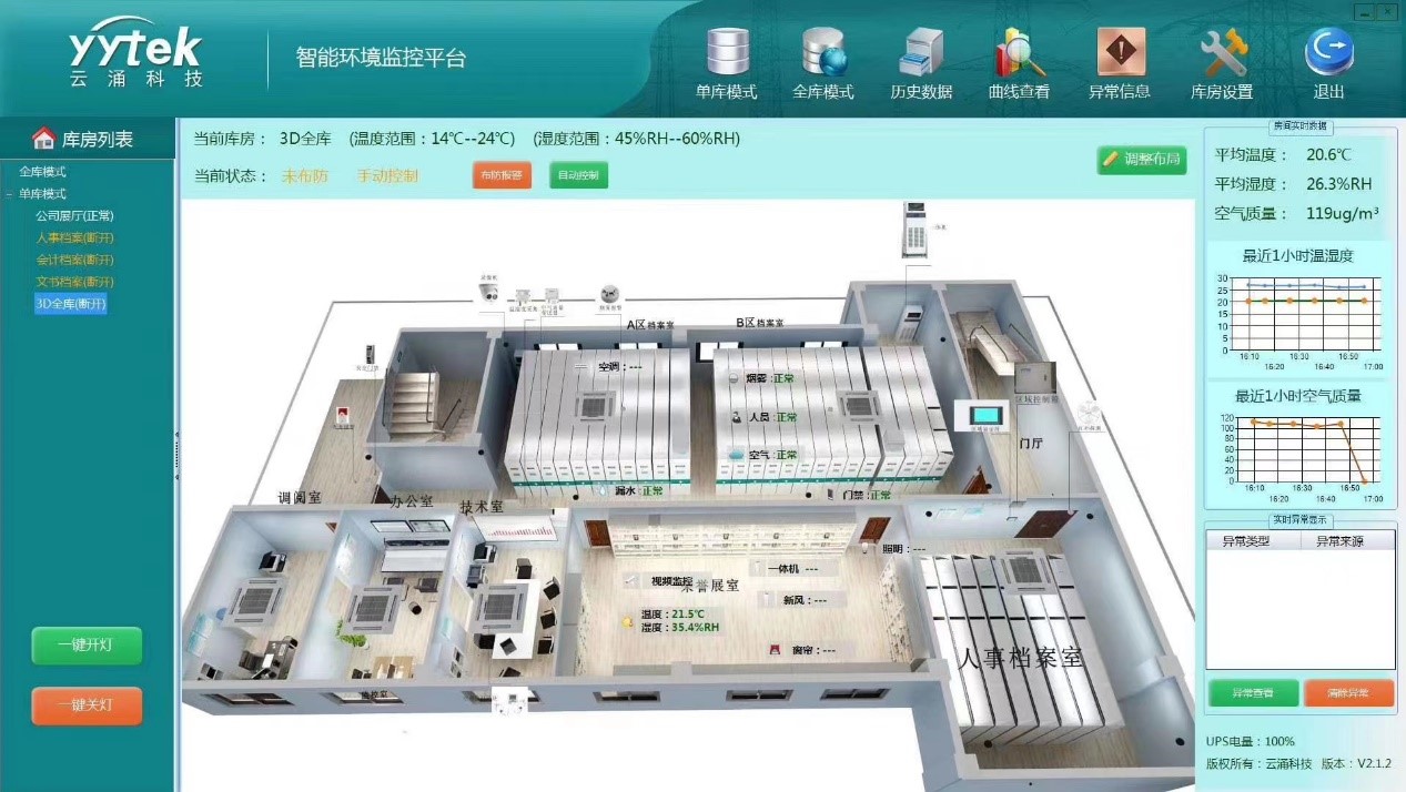 熊猫体育档案一体化管控平台,集成了物联网云平台、低功耗的物联网通信技术,环境监控系统,底层传感器采集,电机控制,结构设计等技术,利用云平台的处理能力和存储技术,构成一个一体化、网络化的集中监控系统,提高日常维护效率,降低劳动强度和人工成本。
