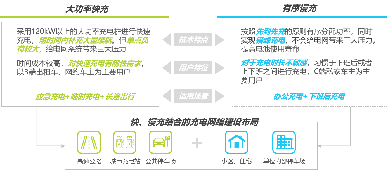 充电模式的有效发展:大功率直流快充成为刚需,充电难并不仅仅局限于充电基础设施的数量与分布上,如何有效提高充电效率同样重要,大功率快充和有序慢充体系的结合为未来充电模式的发展方向。